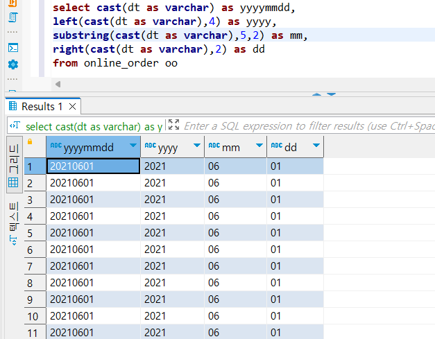 - substring(cast(_ as varchar),시작,개수) => 중간 개수