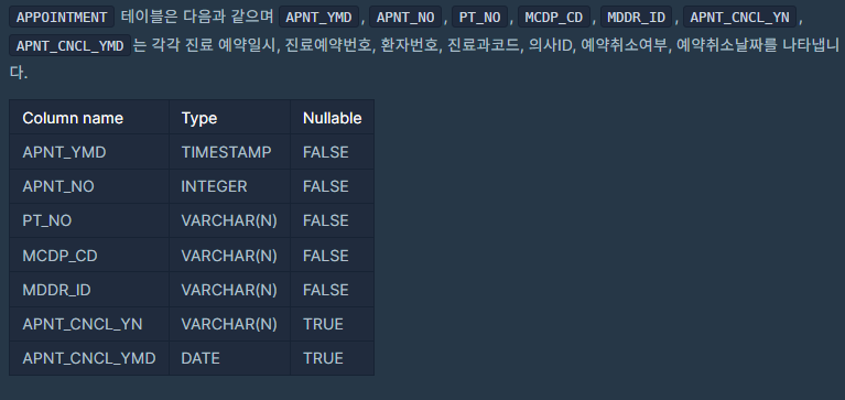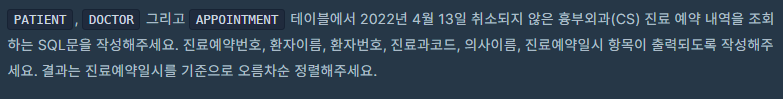WHERE a.APNT_YMD LIKE '2022-04-13%' AND a.APNT_CNCL_YN = 'N' AND a.MCDP_CD ='CS'
