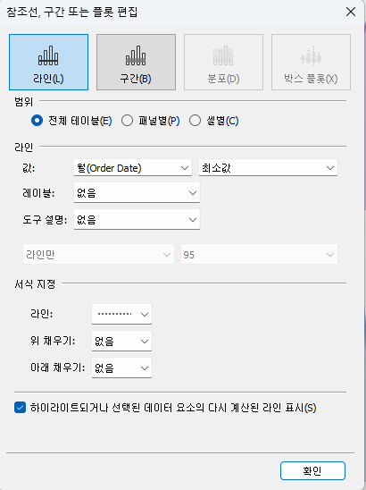 참조선 편집 => 월+최소값 & 하이라이트되거나 선택된 데이터 요소의 다시 계산된 라인 표시 체크!!