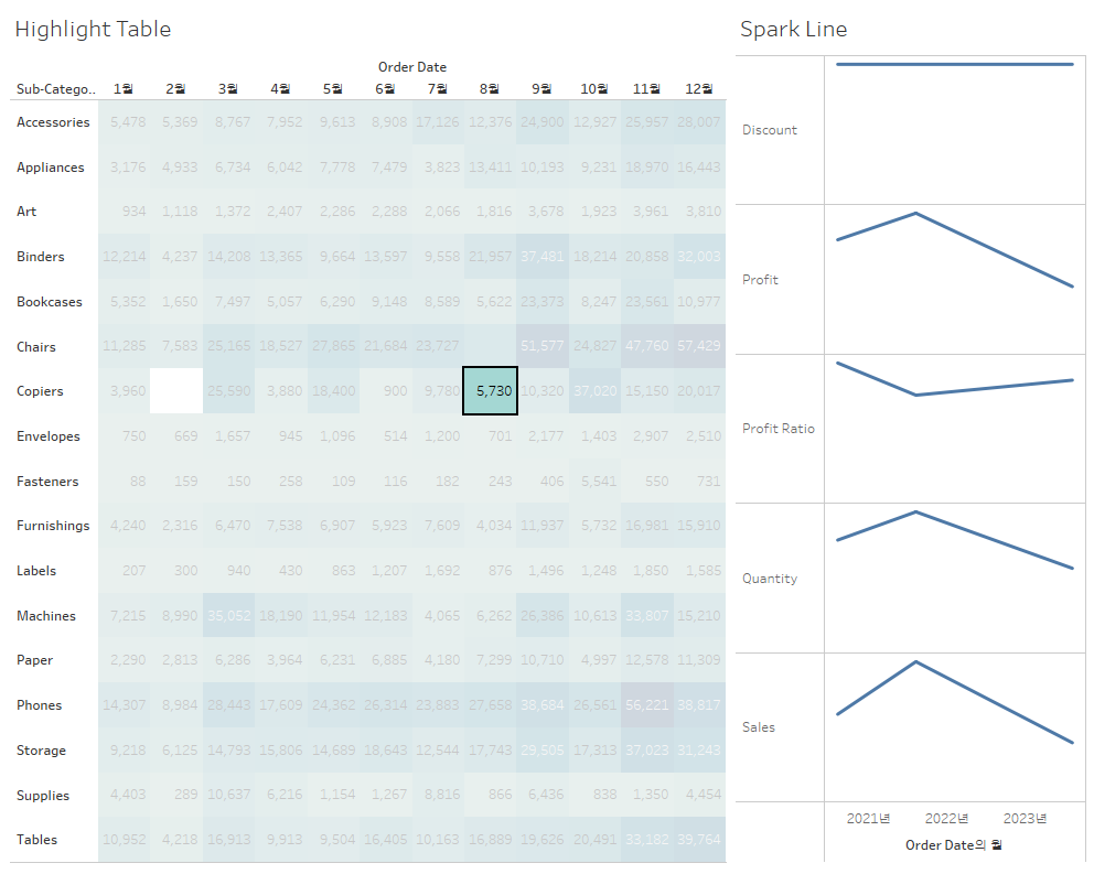 위 테이블에서 Highlight Talbe의 값을 클릭하면 Spark Line이 바뀜