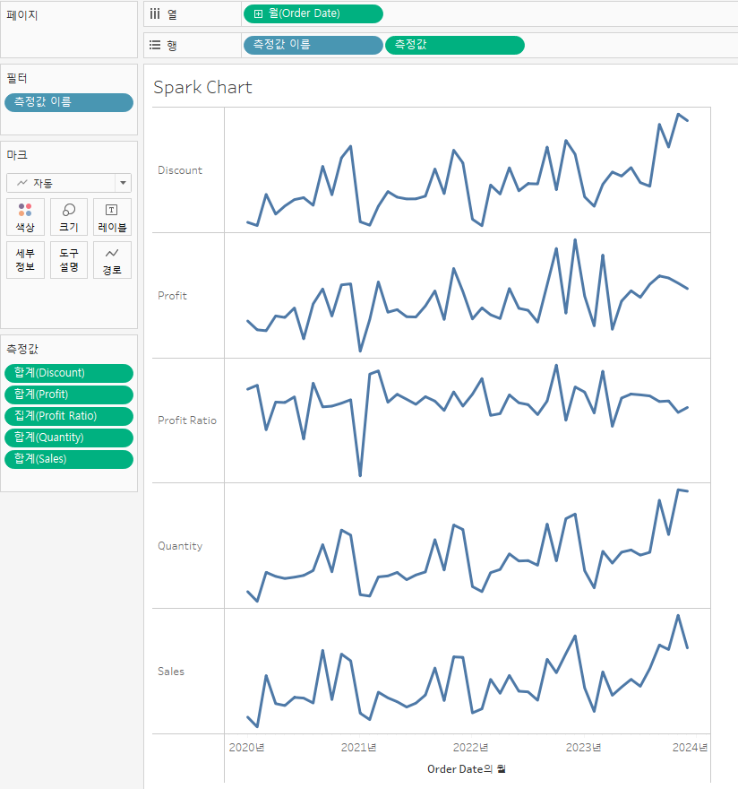 [Tableau] 시간에 따른 데이터 시각화(Dual-Axis Line, 100% Stacked Area,Slope,Spark Line,Calender) 본문