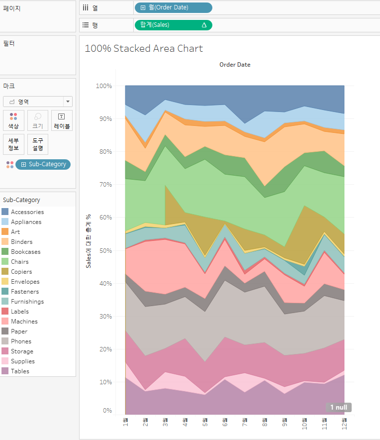 Q. 월별 서브 카테고리의 매출액을 100% 누적 영역 차트로 그려라.
