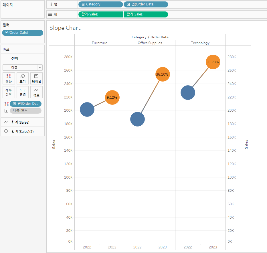 카테고리를 년도별 판매총액을 Slope Chart로 나타내라